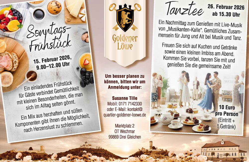 Die Drei Gleichen Vermietung bietet Ihnen eine Zimmervermietung im Quartier Goldener Löwe in Wechmar und in Kleinrettbach in verschiedenen Zimmerausstattungen an. Wir vermieten für Veranstaltungen und Feiern schöne Räumlichkeiten gern auch inkl. aller Services wie Catering, Musik und Logistik. Regelmäßig veranstalten wir Events wie unseren beliebten Tanztee und ein kommunikatives Sonntagsfrühstück. Gern geben wir unseren Gästen Empfehlungen für Ausflüge in der Region Thüringer Wald.